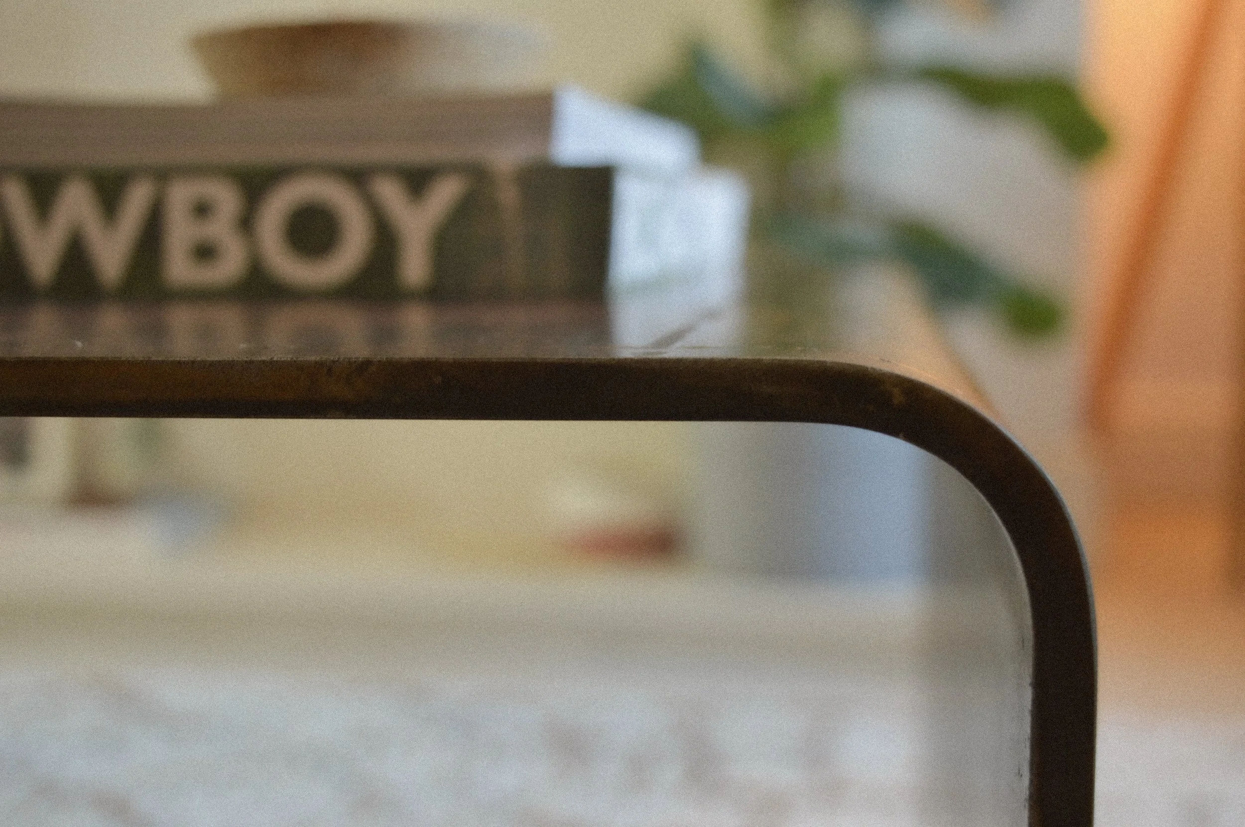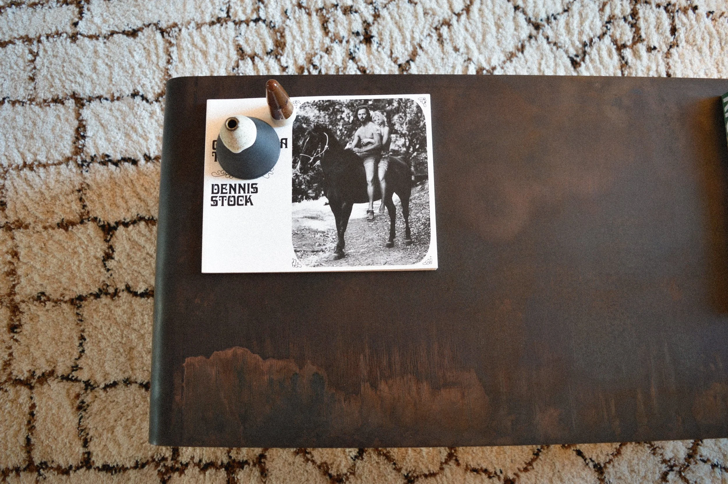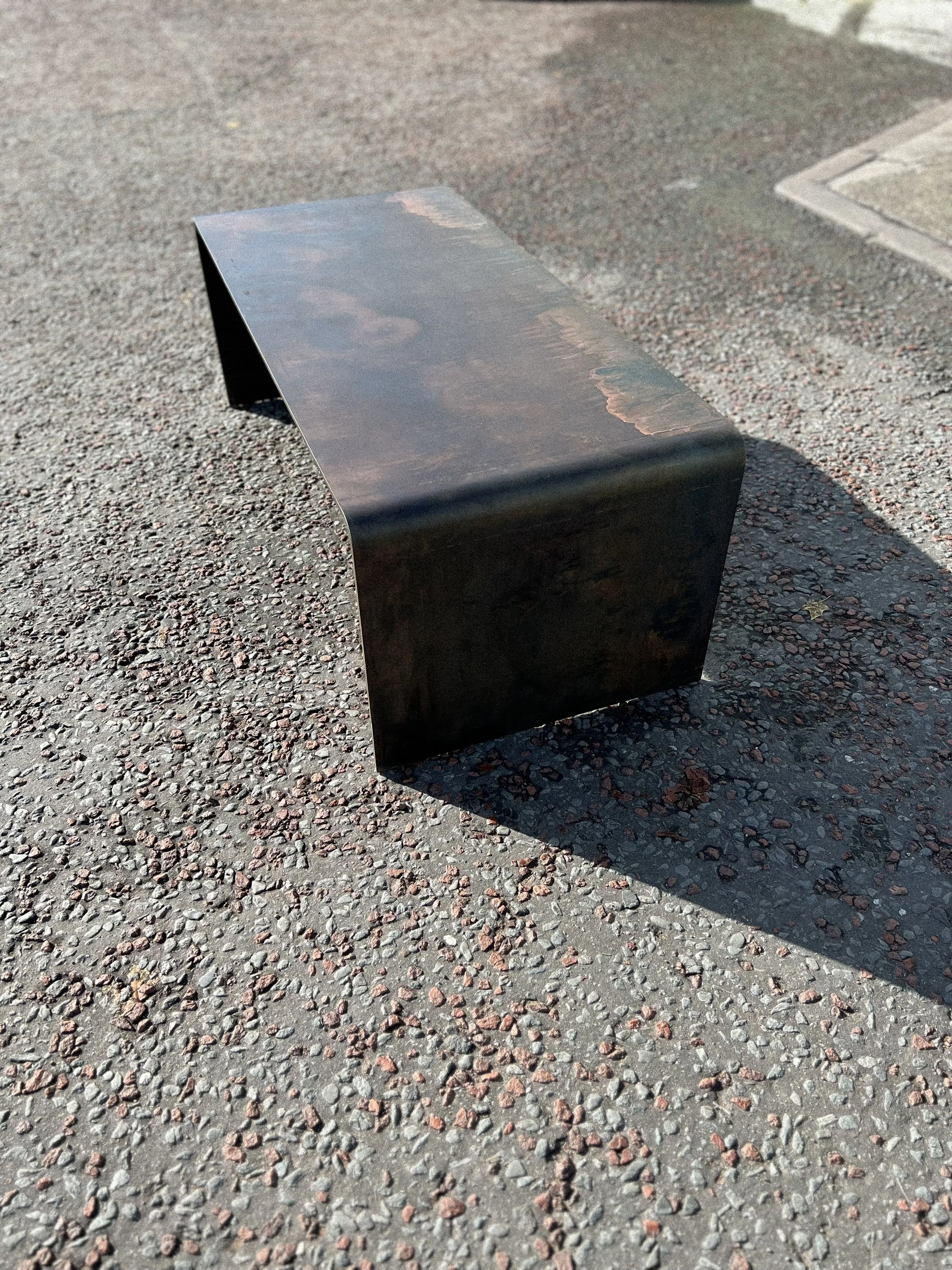 A bespoke commissioned steel table, complete with a patina’ed finish. Inspired by the fluid forms of bent glass coffee tables, it reinterprets the concept with raw, industrial strength.